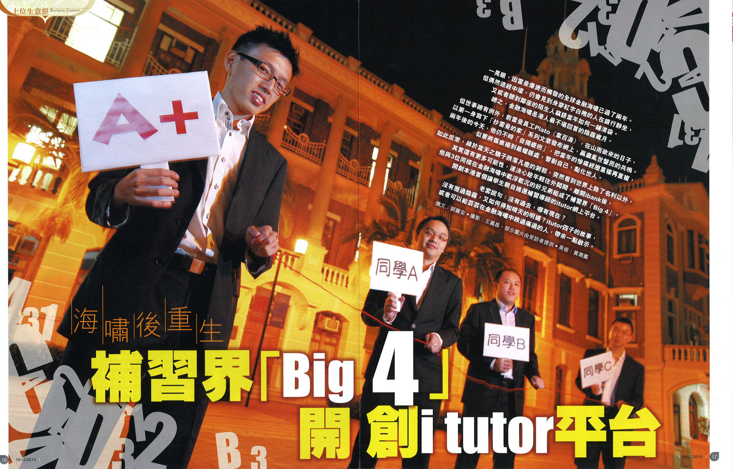 如此反常,緣於當天之驕子跌落凡塵的剎那,突然看到世界除了名利以外,其實還有更多可能性,逐決心趁年輕往外闖闖。離開ibank後,他與3位同樣在金融海嘯載浮載沉的好兄弟組成了補習界「Big 4」,開創本港首個讓學生親自挑選補習導師的itutor網上平台。