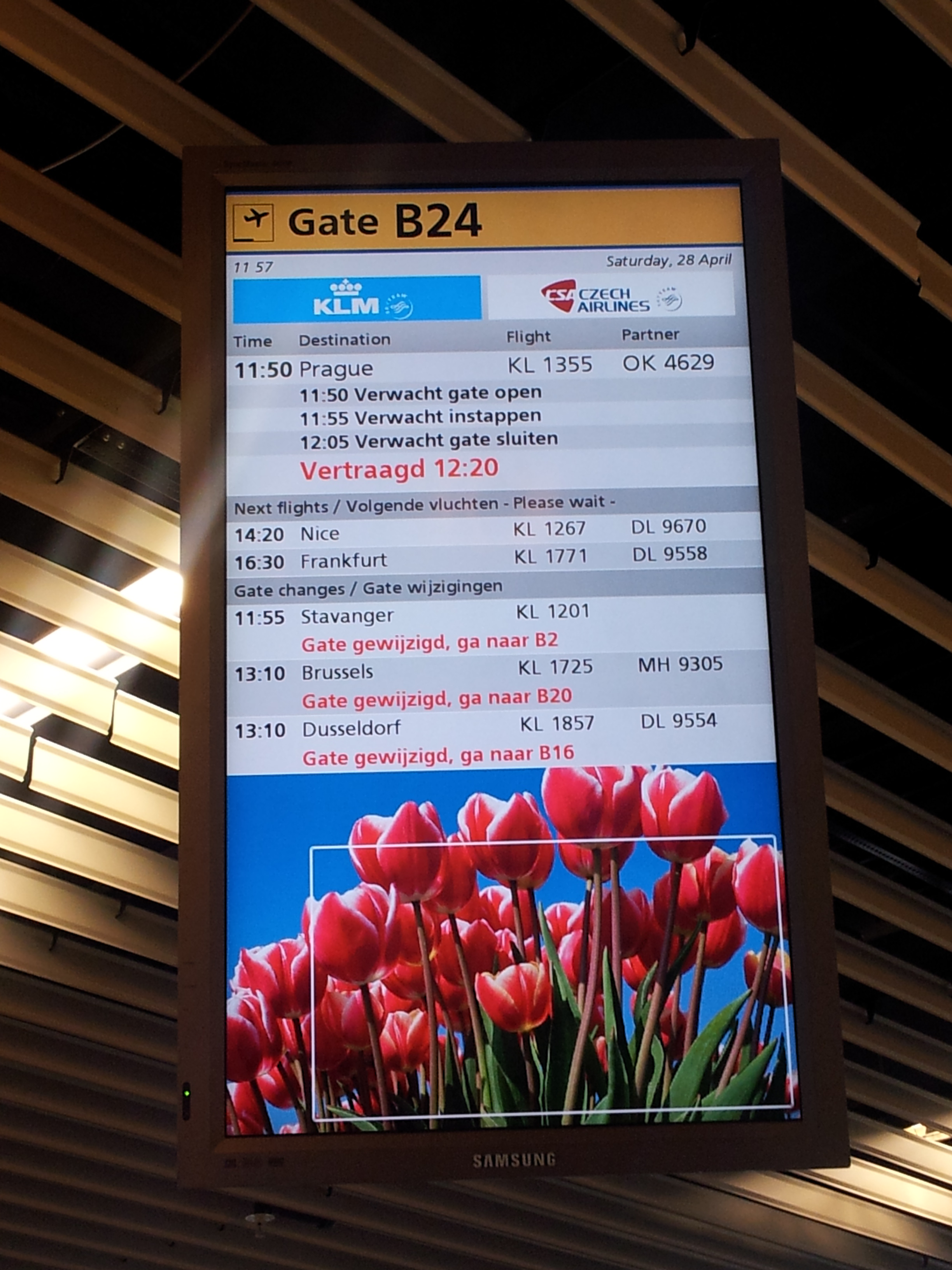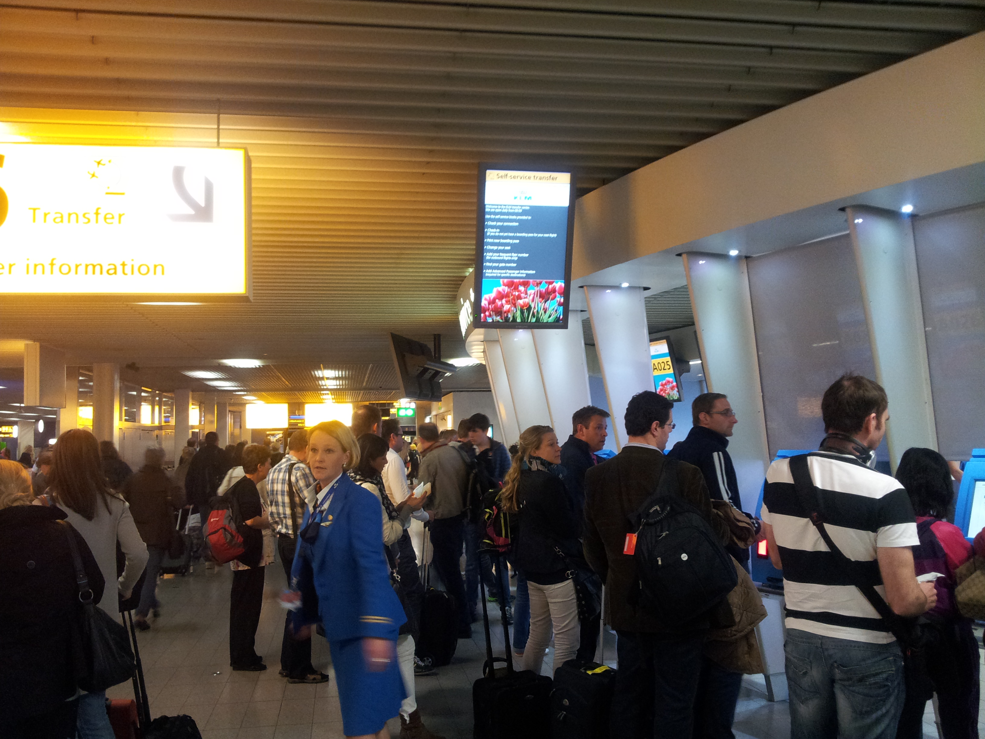 如我所料,阿姆斯特丹去布拉格 (Prague) 的飛機是早上7時正,但我們降落時已差不多8時!遲了1小時,我們都懶得趕去閘口,斯斯然的落機。去到 KLM 的駁機櫃位,原來他們連幫駁機乘客這件事情都已自動化,職員們的職責只是笑笑口的指乘客去櫃位,有需要才過來拔刀相助。我和 Cam 將本來去布拉格的登機證電子條碼在掃描器掃一掃,「Dood」一聲,部機便快快的印了4張紙出來。第一張是新登機證,電腦已將我們安排在下一班12點飛布拉格的航班當中;第二張是 EUR 10早餐券;第三張是可以打10分鐘的電話券;第四張是EUR 50的 KLM 現金券,下次幫趁時可以用 (但寫了姓名不可以轉贈)。Well,咁體貼的安排,我們還有什麼好講?!我只能講一句:做得咁細緻,肯定就是因為它們的航班經常「走機」,所以索性投放資源搞一個這麼完善的「走機系統」。你諗你:是否想冒這個險去搭一間已經完全準備好delay 你航班的航空公司啦!?