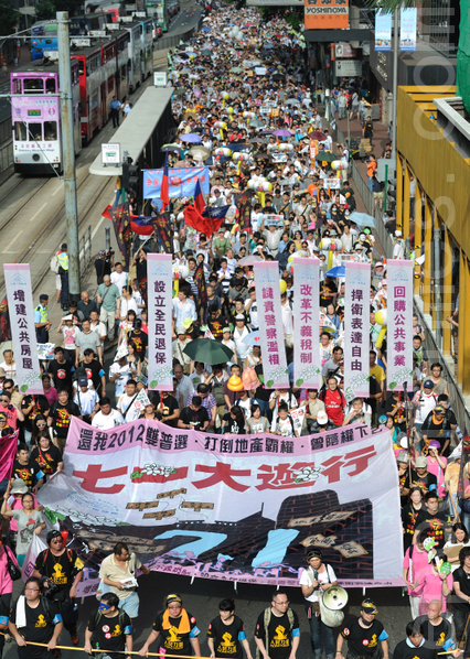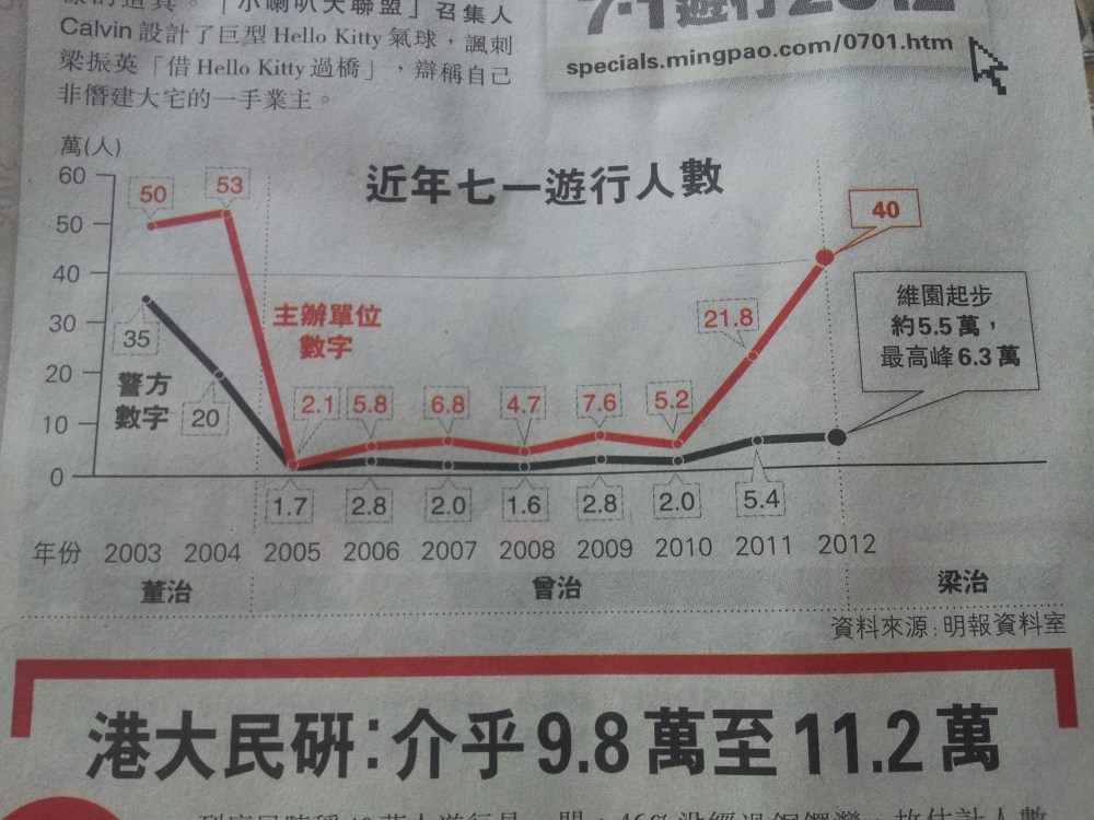 我們應該尊重多年來一直為香港努力的民陣,年年風雨不改搞這個7.1遊行。今年當我看見他們拋出來的遊行人數:40萬,認真嚇親!咁多人!!但當之後看到再讀到港大民調大概10萬人的數字,卻令我感到很氣餒。不是為上街的人數多少而感到氣餒 — 在電視上看到的畫面已說明了一切;我感到氣餒、失望、難過的是為什麼連民陣都要跟警方一般低手玩這種數字遊戲?港大民調是3個公佈了數字中唯一政治中立的團體,我認為是最可信的。他們分別公佈兩組不同的數字:「8萬多」和「介乎9.8萬至11.2萬」。我就算給他們的統計5萬人的誤差, 都還是20萬人不夠,是40萬人的一半也沒有!!民陣的40萬人跟這個20萬相差20萬,警方的6萬跟這個20萬相差只是14萬,即是民陣的數字比警方的 還要誇大!好好地一個遊行,為什麼要這樣子為自己加上一個污點?當你們聲嘶力竭地鬧爆CY的誠信問題時,自己又這樣子作大人數,矢志加強氣勢,又是不是跟CY一樣在「擘大眼講大話」?這樣是否另類的「誠信」問題?