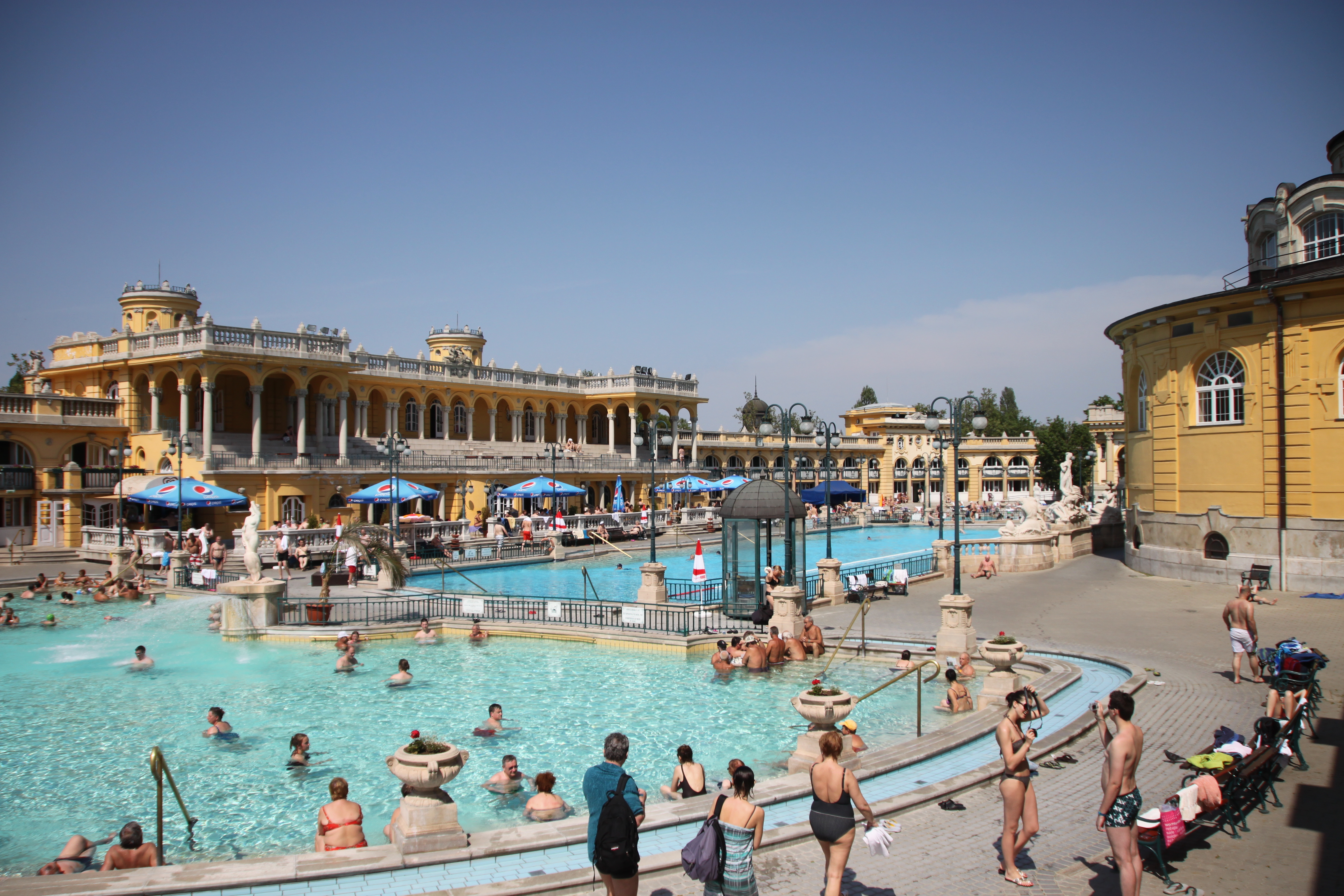 室內的浴池都只是是前菜,我們這些去慣日本的香港人看見這些小小的池簡直不放在眼內!但走出戶外就不得了,認真是嘩嘩聲!倘大的戶外池簡直就是壯觀、震撼,我似走進了匈牙利皇帝的私家後花園一般,第一個印象就是歷代昏君的「酒池」肯定就是這個模樣!肚滿腸肥的皇帝笑口淫淫的浸在池中,四圍的人群換成手執葡萄和美酒的美女,位位爭先向池中的皇帝獻媚……