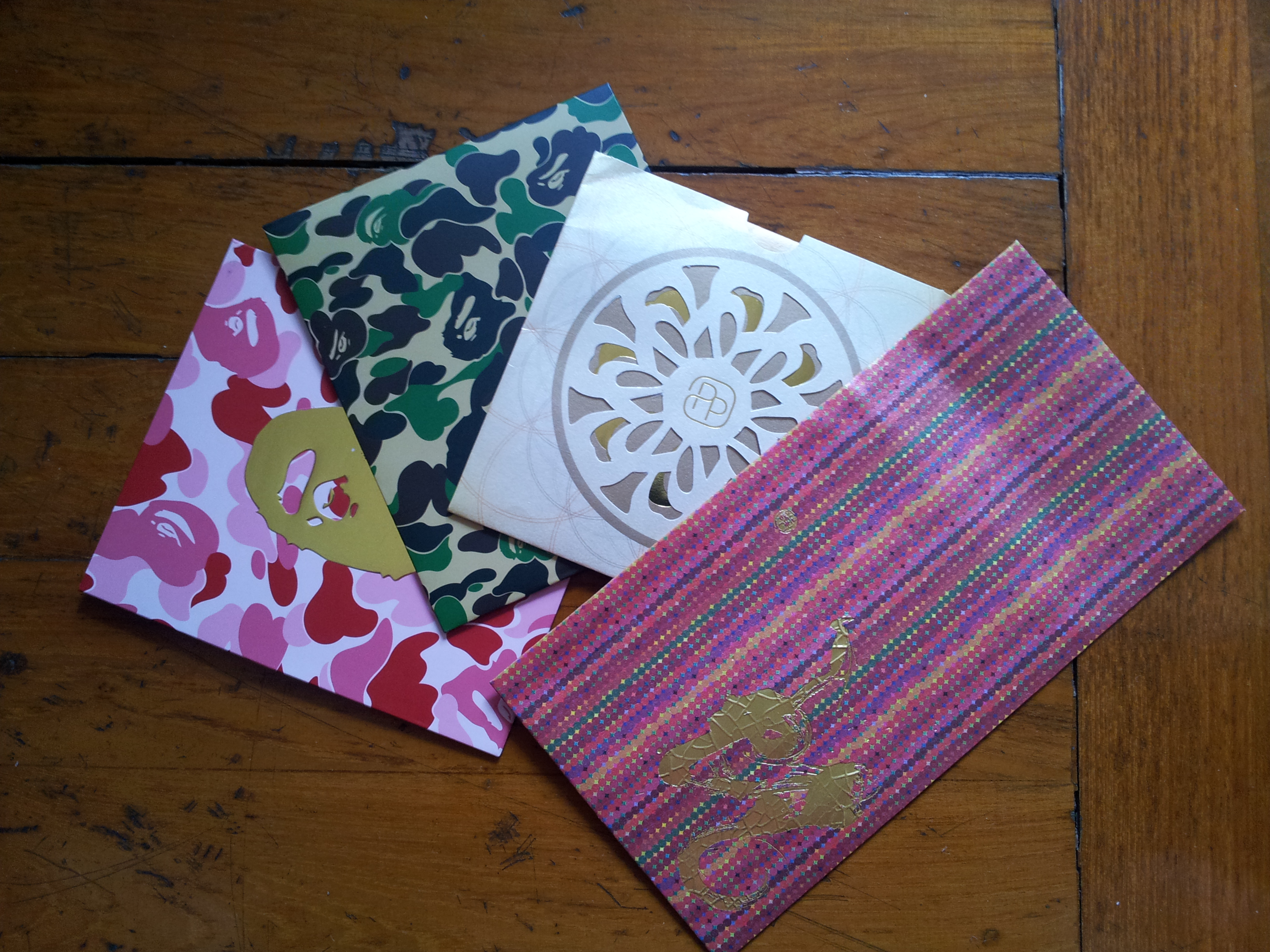 去年我收到最靚的利是封是 Bathing Ape。今年暫時 (都未過十五!) 是 Pacific Place 的風車面轉轉設計 (抽出內裡的金色利是封時,面頭的風車圖案會轉),海港城那色彩繽紛的設計也不錯。
