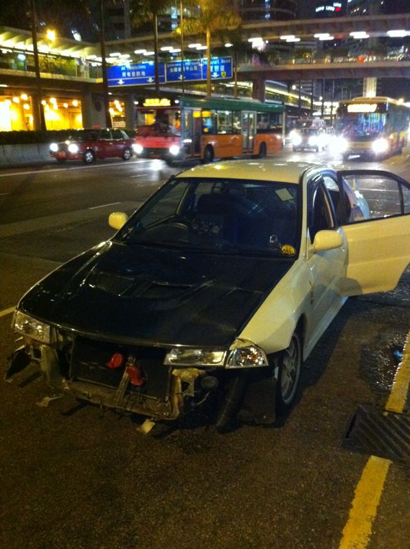 大慨等了5分鐘,兩架鐵馬齊聲到達。警察叔叔話我們搞到後面好塞車,問我們可否先開走駛埋一邊。前面 640i 當然無問題。我望著小白,試試啦。咦,又ok喎!我和 640i 就跟著在前面開路的鐵馬穿過隧道,在盈置大廈外面停下來,等落口供。但後面那車良久都還未到,可能是撞到行唔到!這時候我再望清楚小白的情況:前面的鬼面罩甩了一個,左邊車頭撞凹了,車頭蓋被撞得拱了起來;後面就仲傷,基本上整個大包圍被撞得甩了出來,只是左邊輕輕的拖住,bumper 的中間也被撞得拱起來,搞到車尾廂彈起不能關嵌。等著等著,那架打仔車終於好像有點「訖吓訖吓」的來到了。