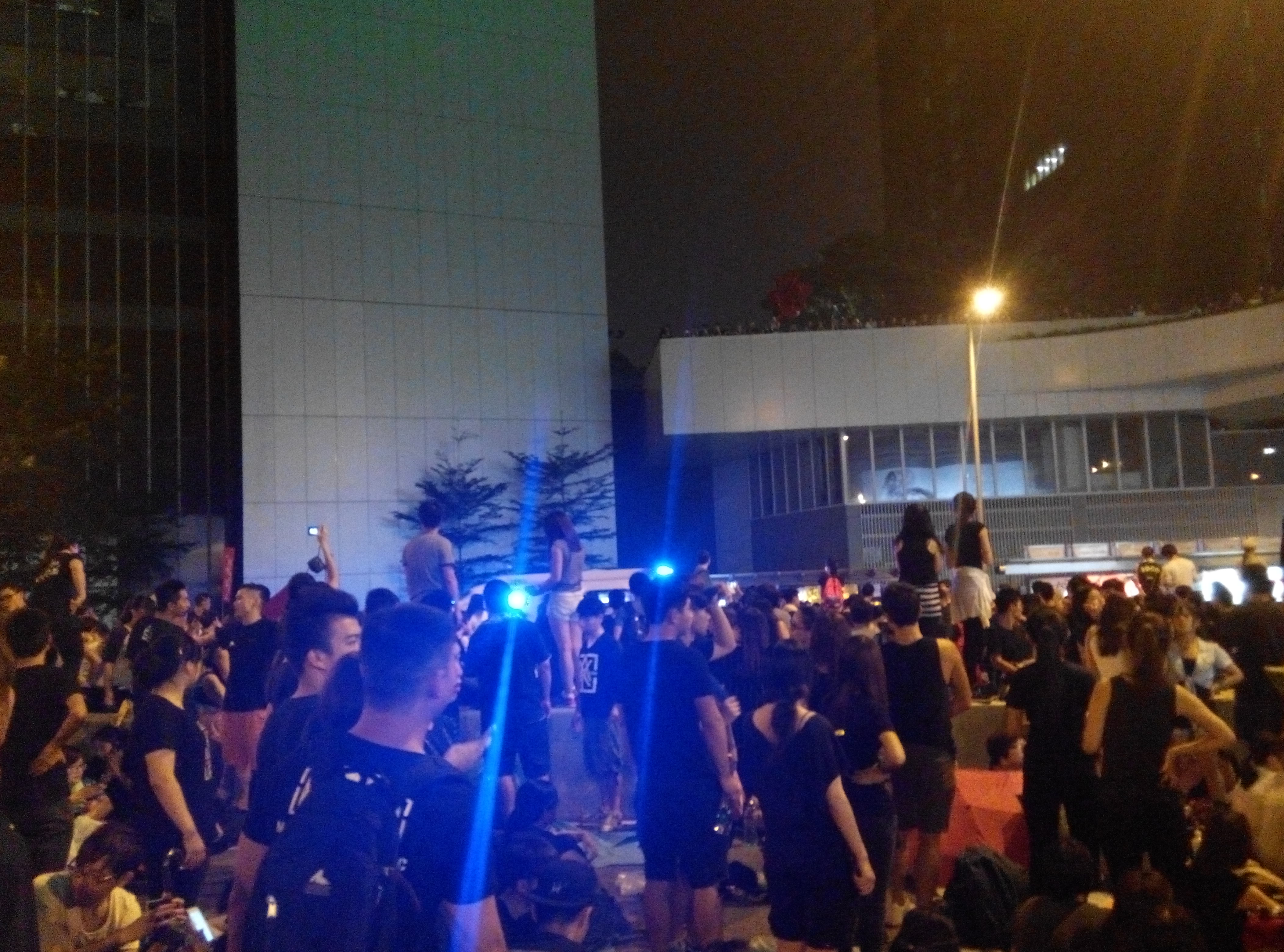 十‧一前夕的晚上,晚飯過後我跟 EC 來到交易廣場,慢慢的向灣仔方向走過去。人數比我們在電視上看到的還要多,由文華酒店向金鐘方向望去,人頭湧湧。雖然已經是晚上,黃昏灑過的一場雨無助降溫,也似乎沒有冷卻這班佔中分子的熱情,。現場氣溫起碼有攝氏28、9度,加上這般擠擁的情況,我估這裡起碼有30度!