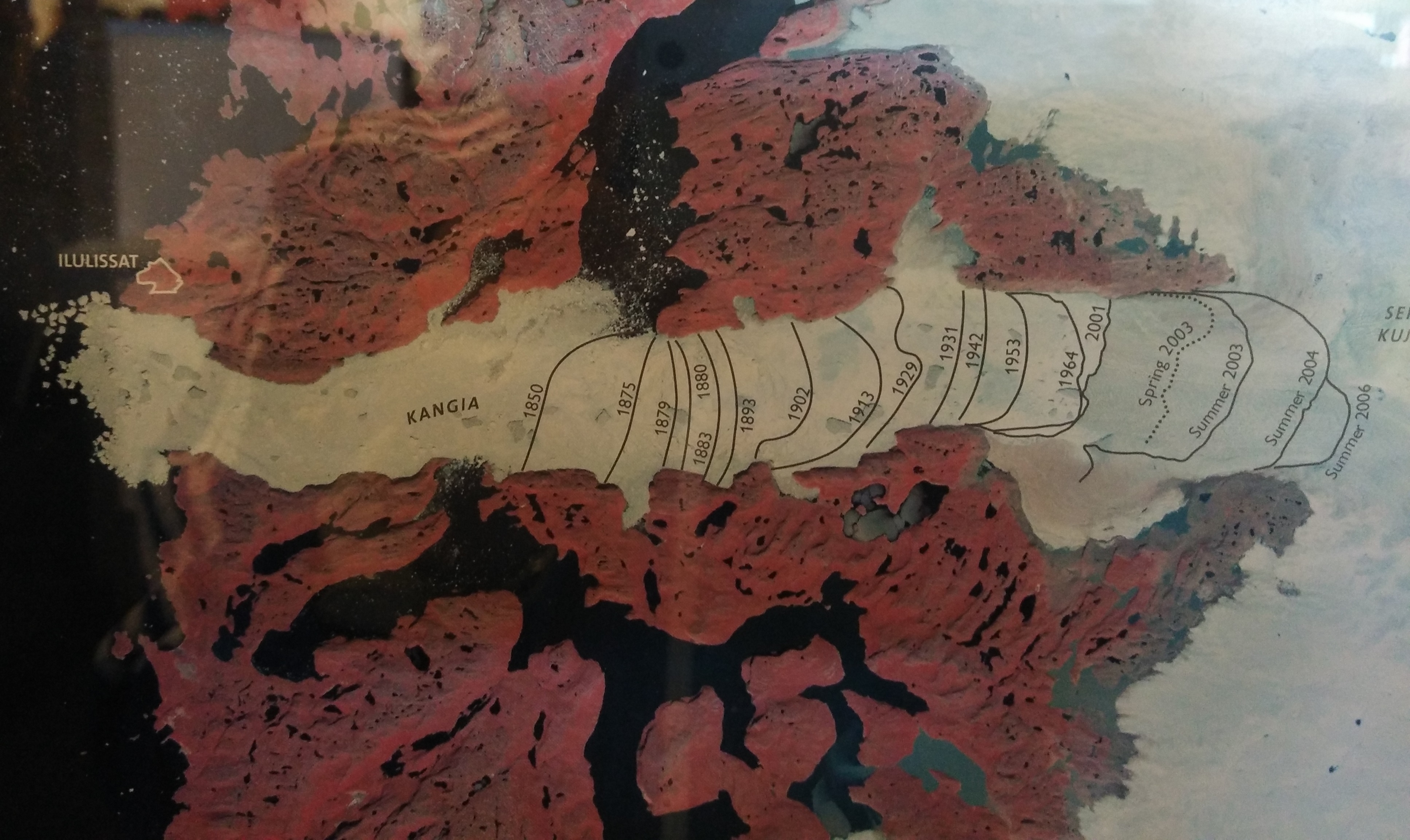 這一片超過4萬公頃的冰川,是世界上最活躍的冰川,每日以40m的速度移動,每年就出產460億立方米的冰山 (老老實實,我真是想像不到那是多少…) 而 Ilulissat 就正正是這些冰山流出海洋的出口,所以在這裡連夏天都看到這麼壯觀的景色。跟世界各地一樣,Kangia 都因為全球暖化的關係,融化得越來越快,所以個出口比小弟的髮線上升來得更厲害!看看下面這幅圖,就可以見到 Kangia 由1850年開始個冰川邊旁一直向入移,即是塊冰川雖然應該是夏天融化,冬天再結冰,但結果是融化成水的速度比結冰快,冰川的面積減少,以前本來是冰的地方已經長期變成海的一部份。
