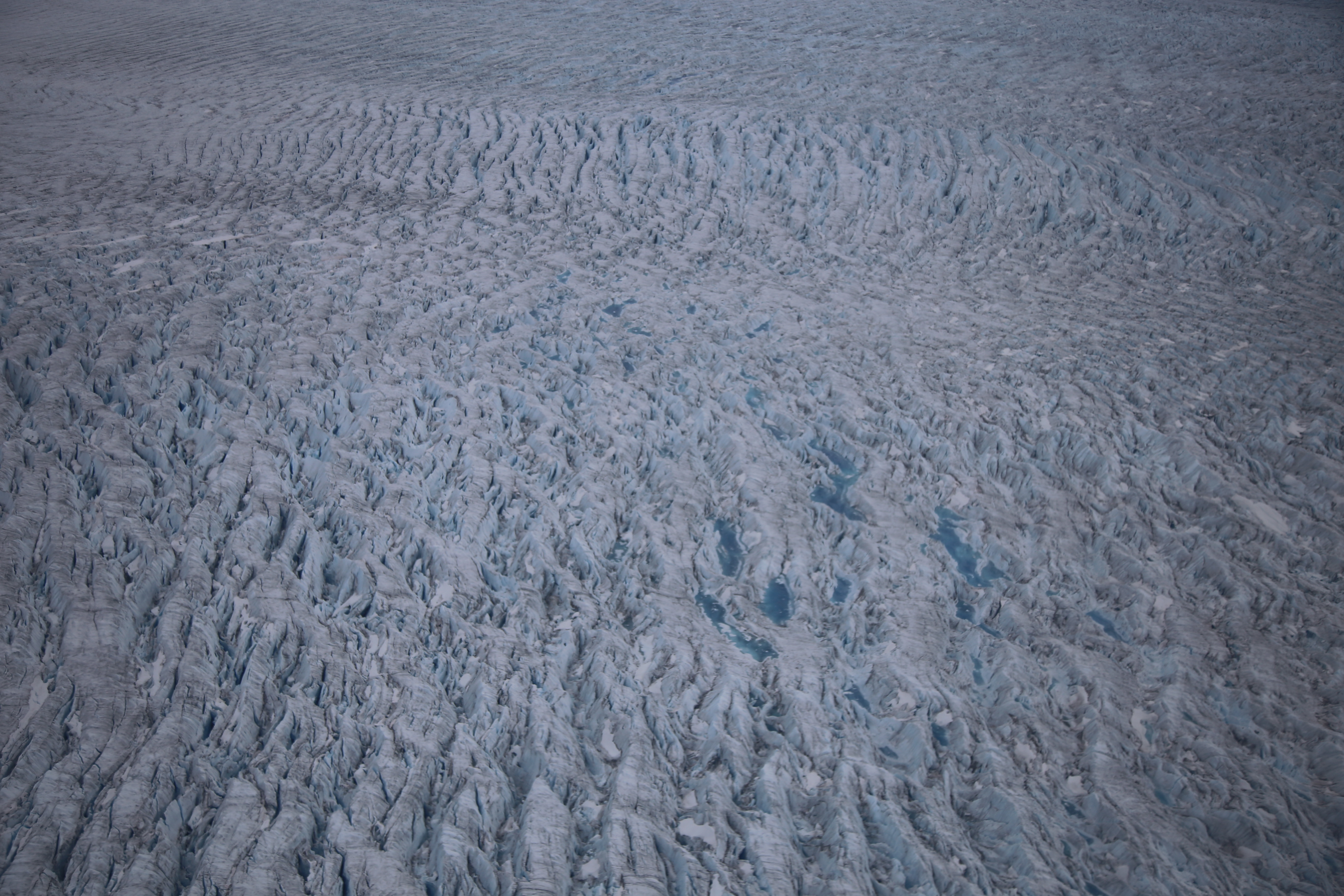 不要以為這些冰川就只是一塊超大的雪地,白朦朦一片;其實一直飛,我們見到這些冰川上的地形都一直在變。有時候一大片平坦的冰片,上面有著縱橫交錯的裂痕;有時候是一片井井有條、一段一段的冰山脈;有時候卻變成毫無章法的一高高低低冰山谷;又有時候看到一個大湖與它的彼岸 — 只不過眼前所有都是被厚厚的冰封了;有時候還會伶伶仃仃見到一片冰做的高原,鶴立「冰」群!