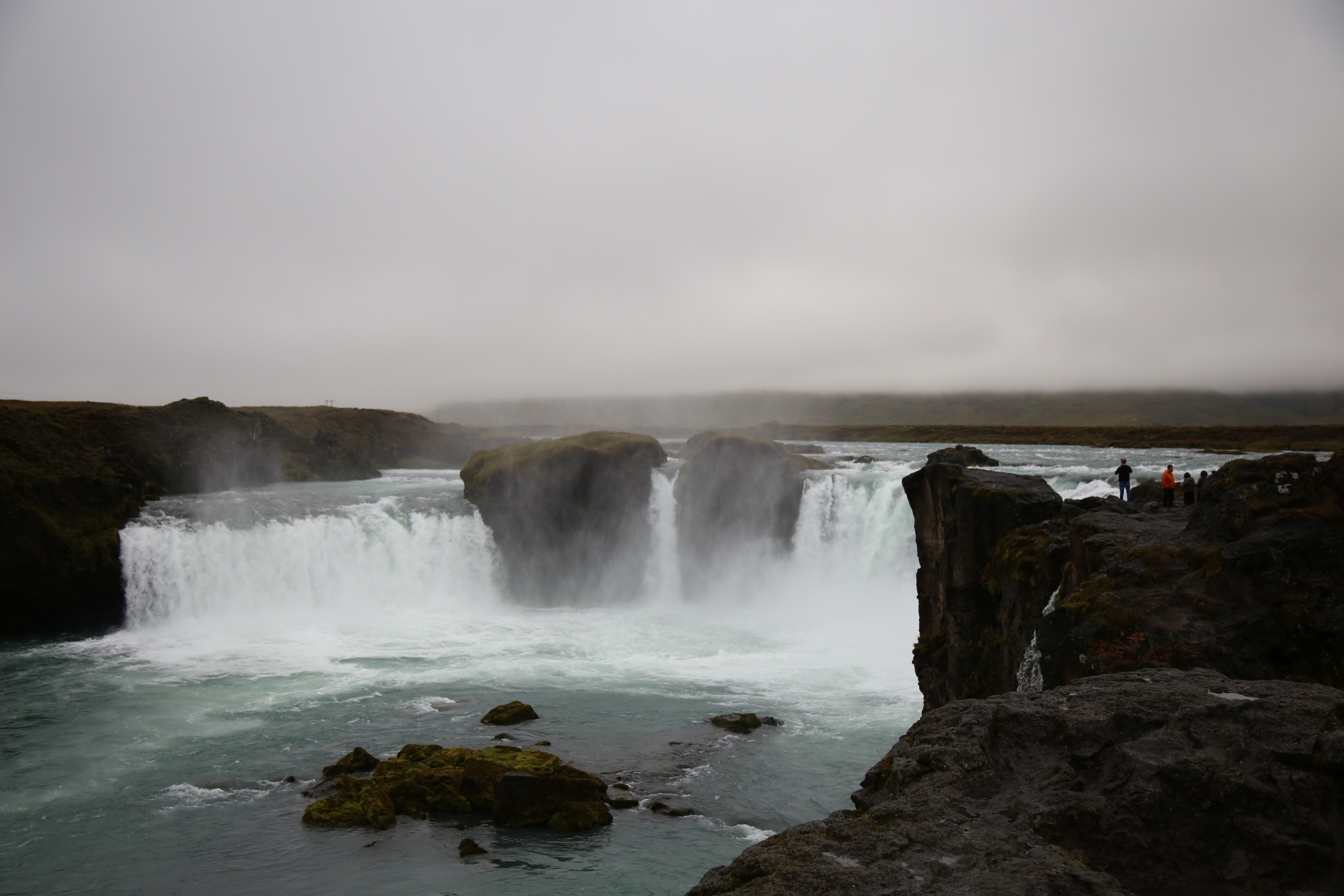 Goðafoss 的位置大概在冰島北部重要城鎮 Akureyri 東邊若45分鐘車程,是我們這次旅程的第一個瀑布,望落確實是幾寬闊宏偉。不過不算高,所以河水衝落來的那股震撼力未算是最頂級。