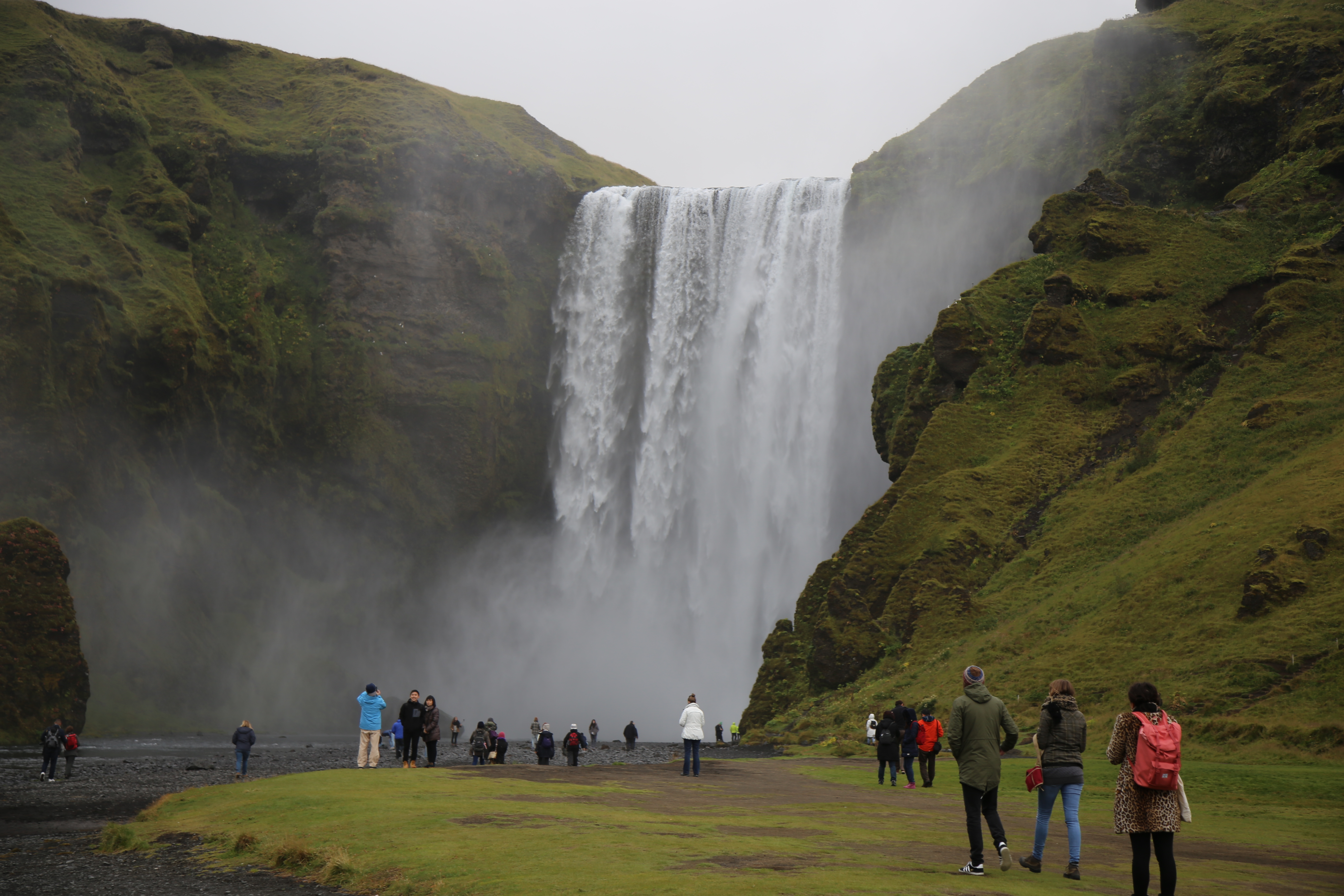 再下一個瀑布已經是在冰島最南部城市 Vik 附近的 Skógafoss,這裡距離首都 Reykjavik 只是大概兩小時車程,所以遊客數目比之前的 Goðafoss 和 Dettifoss 明顯多。如果以人類的身形作比喻,Goðafoss 是一個矮矮肥肥的大肥佬,而 Skógafoss 就是一個高瘦窈窕的淑女,而且那高處流落來的河水落得多麼的優雅,不會彈到水花四濺,四周霧氣重重。