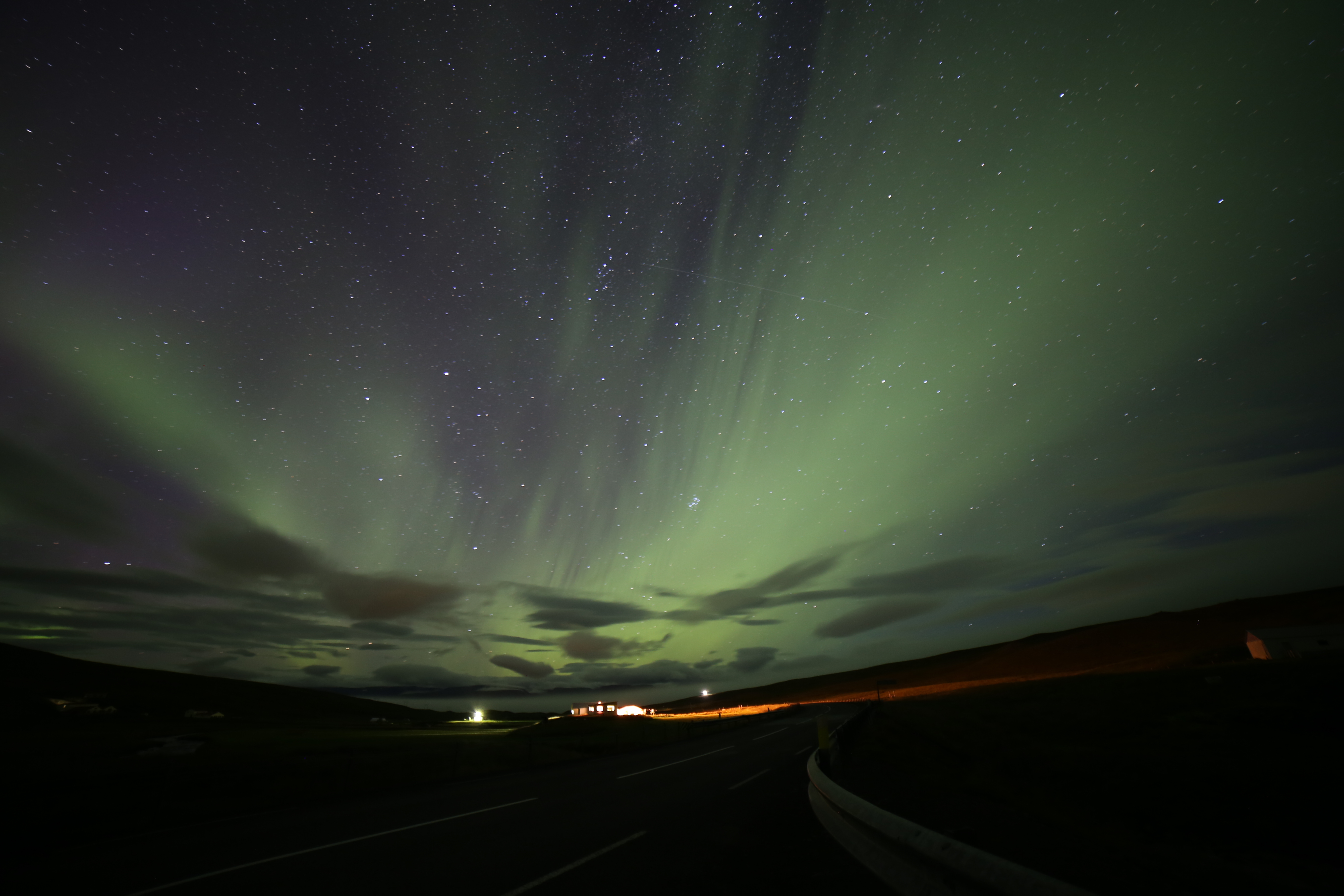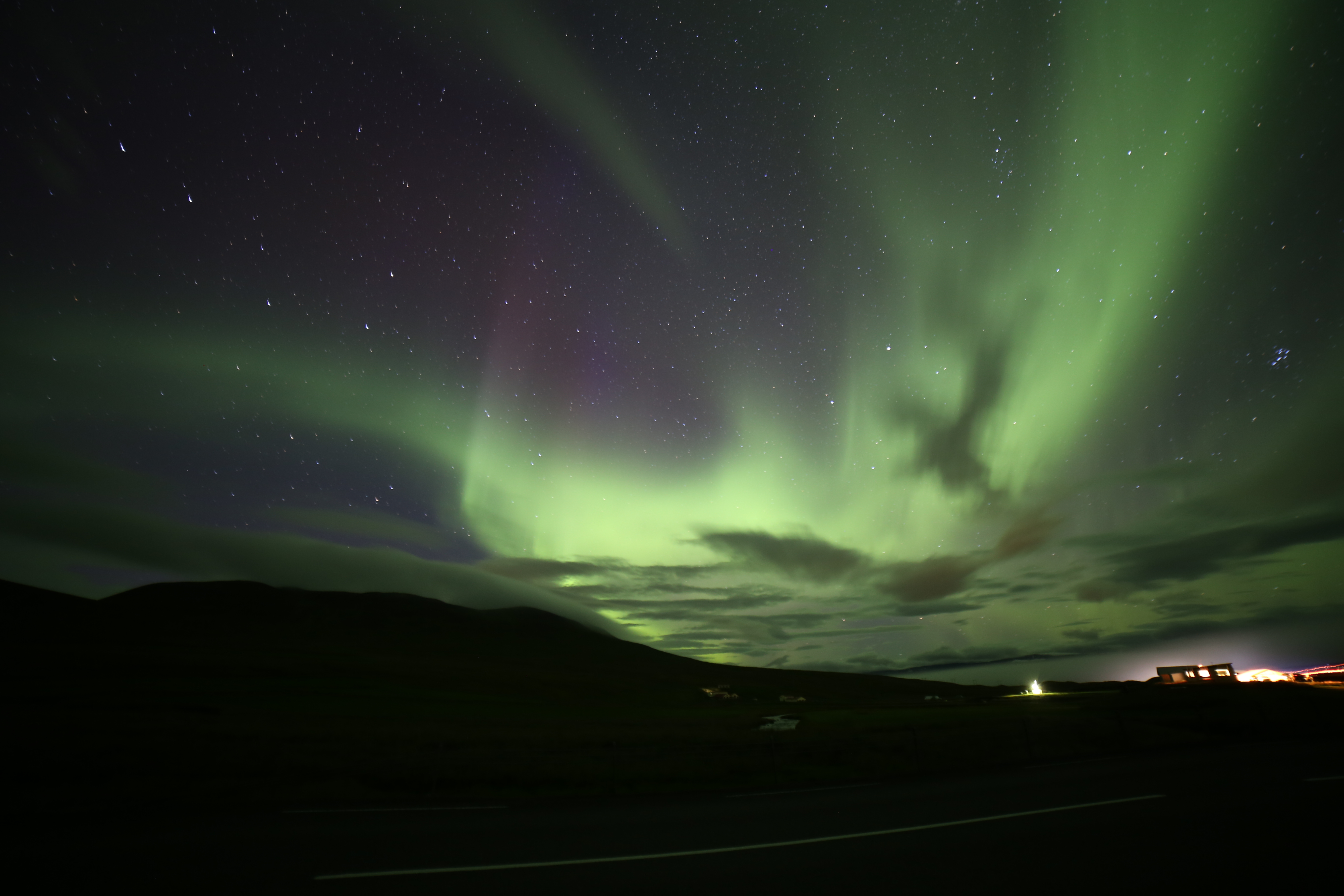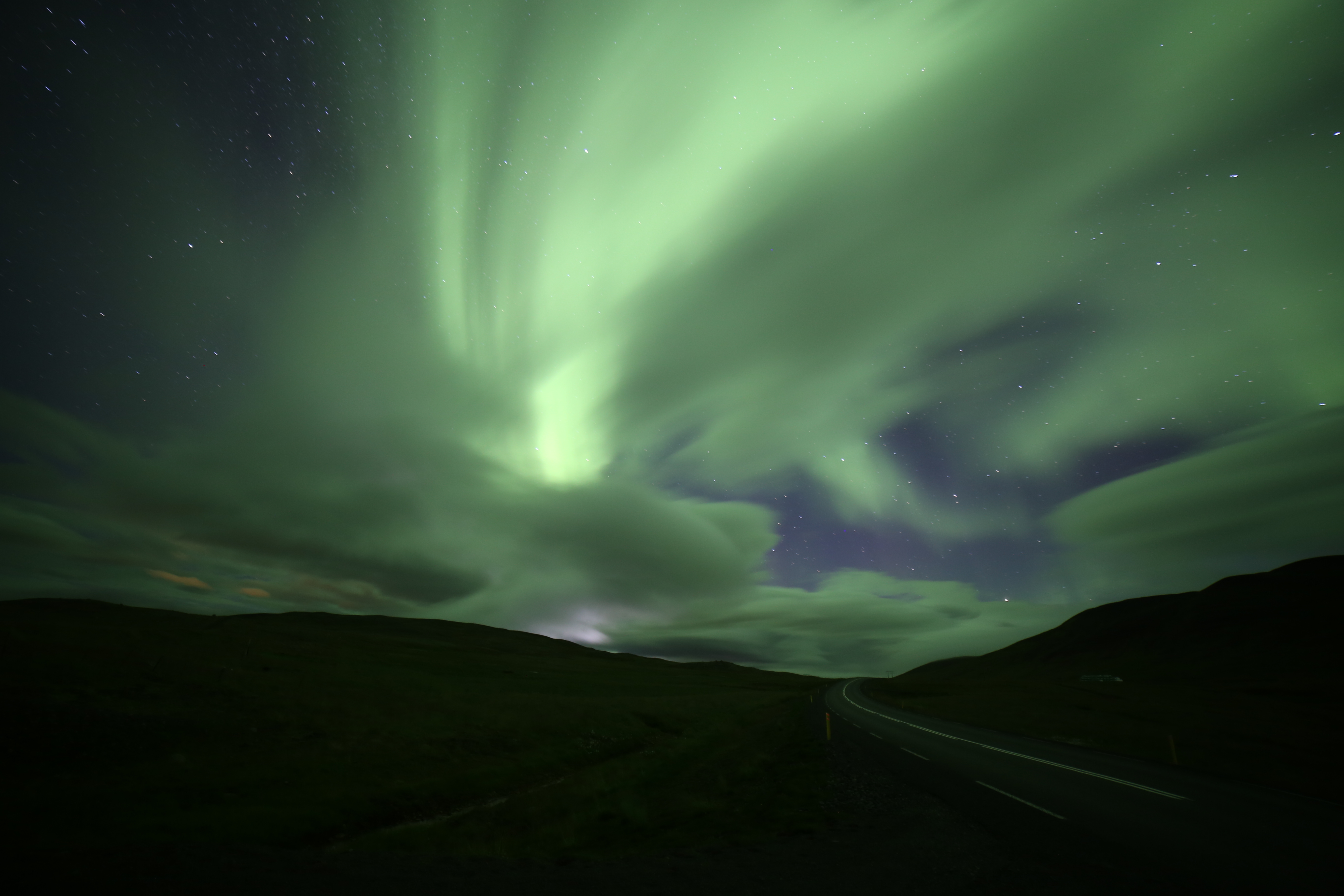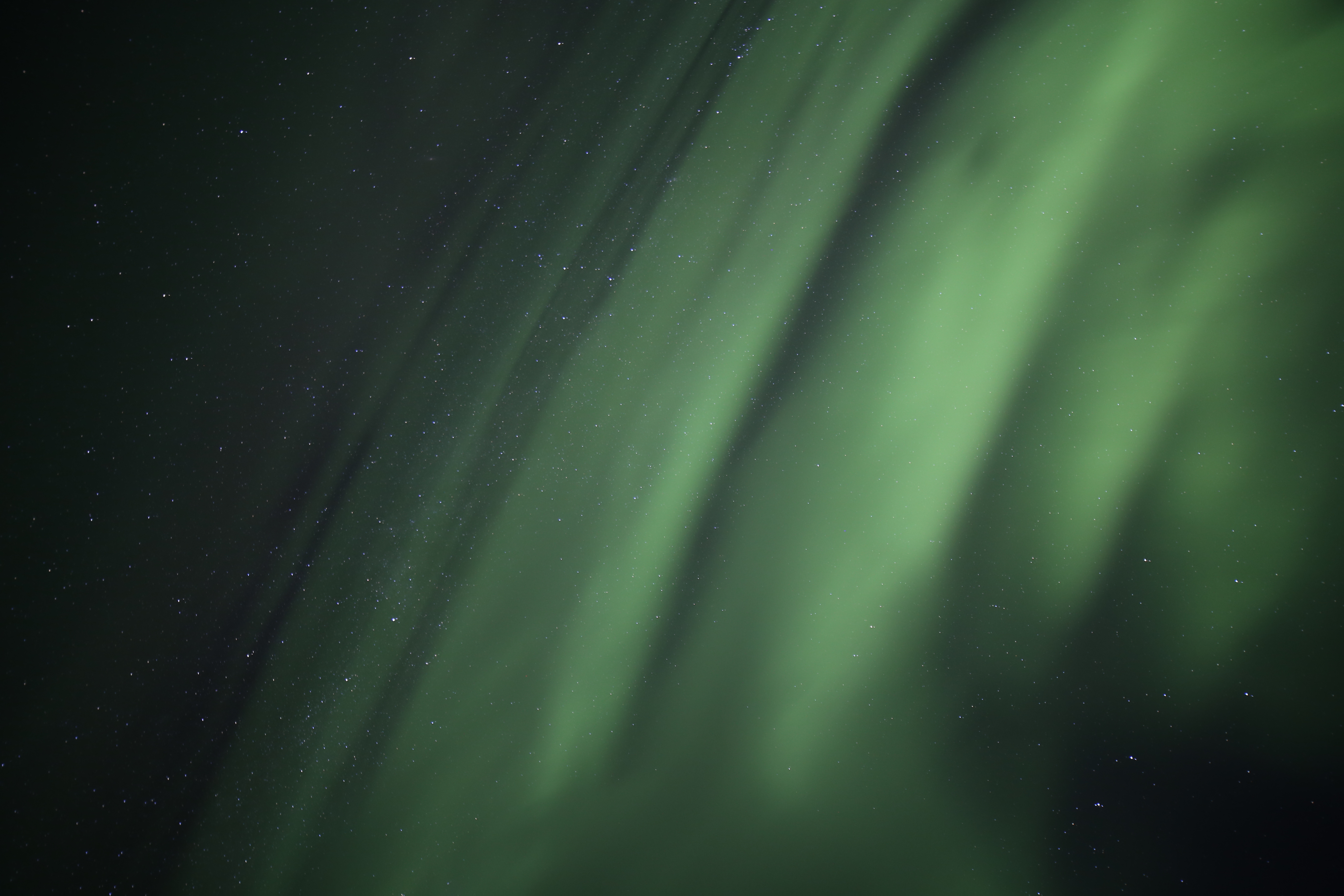 開了個多小時在中途吃了個晚餐之後我們繼續上路,這時天空的密雲漸漸起變化,西方那邊出了缺口,一絲絲微弱的綠光若隱若現。車箱裡的另外四人在興高采烈地討論那是不是北極光,難為我正在以超過100km的時速想盡快送大家到目的地,只能光聽著他們討論,不能轉個頭去偷望。再開了大概半小時,這時大家開始認真認為那股北極光越來越強,強到我們應該要落車拿相機拍。於是我立即找了個路邊的避車處停下來,眾人齊齊拿出架生,在荒山野「路」中受著寒風擺好了腳架,搞好部單反,插埋條快門線,一邊按著快門將眼前一刻攝下來,一邊用我們的眼睛感受著天空中這些由外太空探訪地球的客人留下一條條綠色的軌道。